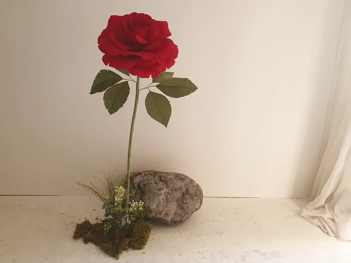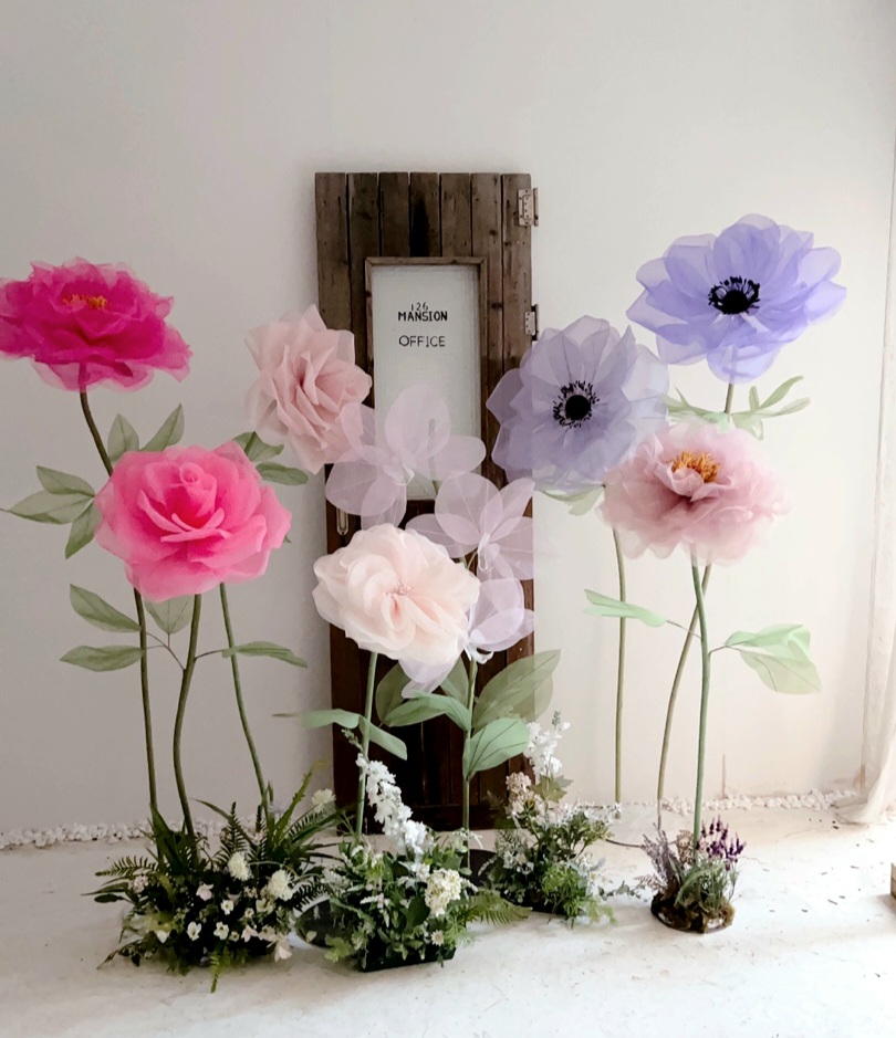 말 그대로 자이언트플라워의 크기지만 종이나 다른 재료를 사용하는 일반 자이언트플라워와 다른 게 원단을 이용해서 만드는 실크자이언트플라워다. 얇은 실크원단을 사용해서 만들었기 때문에 하늘하늘한 느낌이 여성스럽고 사랑스럽다.