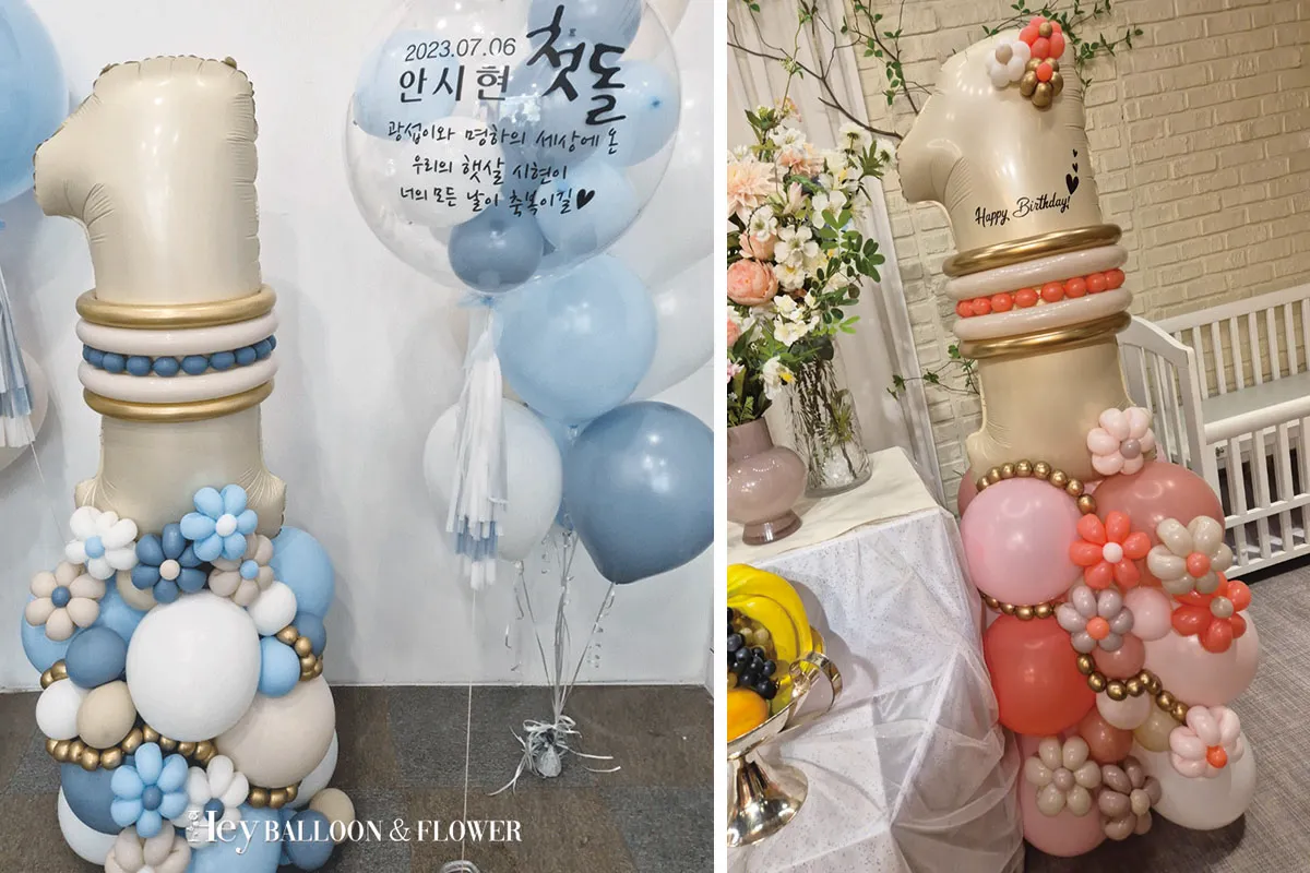 이렇게 돌잔치나 큰 행사에서 사용하는 숫자타워나 헬륨풍선다발은 택배발송이 힘들어요. 숫자타워만 해도 높이만 160cm이 넘거든요. 그래서 보통 직접 픽업을 하시거나 근처로 퀵발송만 가능해요.