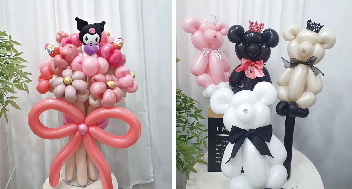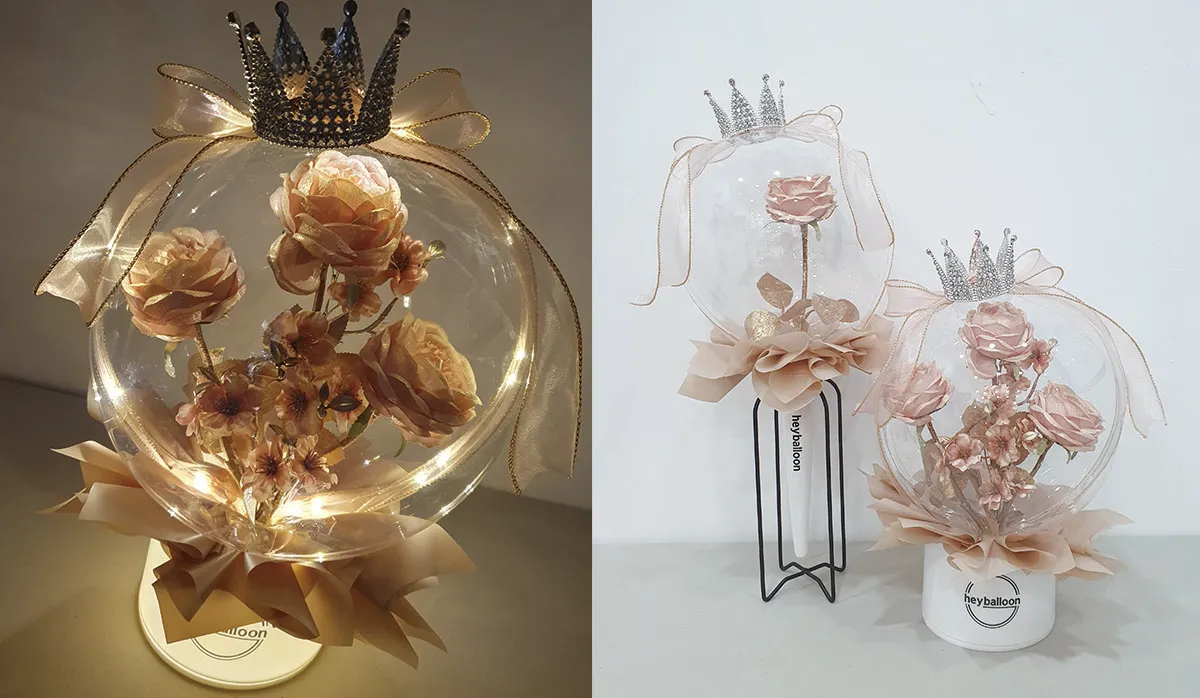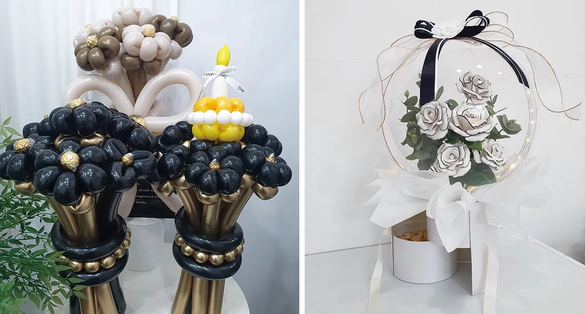인형과 초콜릿 등을 넣기도 하지만 풍선으로 동물 모양을 만들어 넣는 방식의 꽃다발도 귀여운 선물이 될 수 있어요.