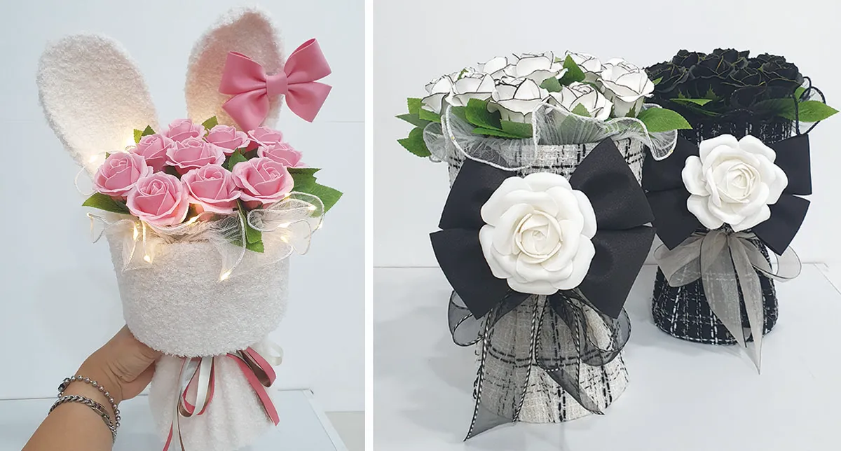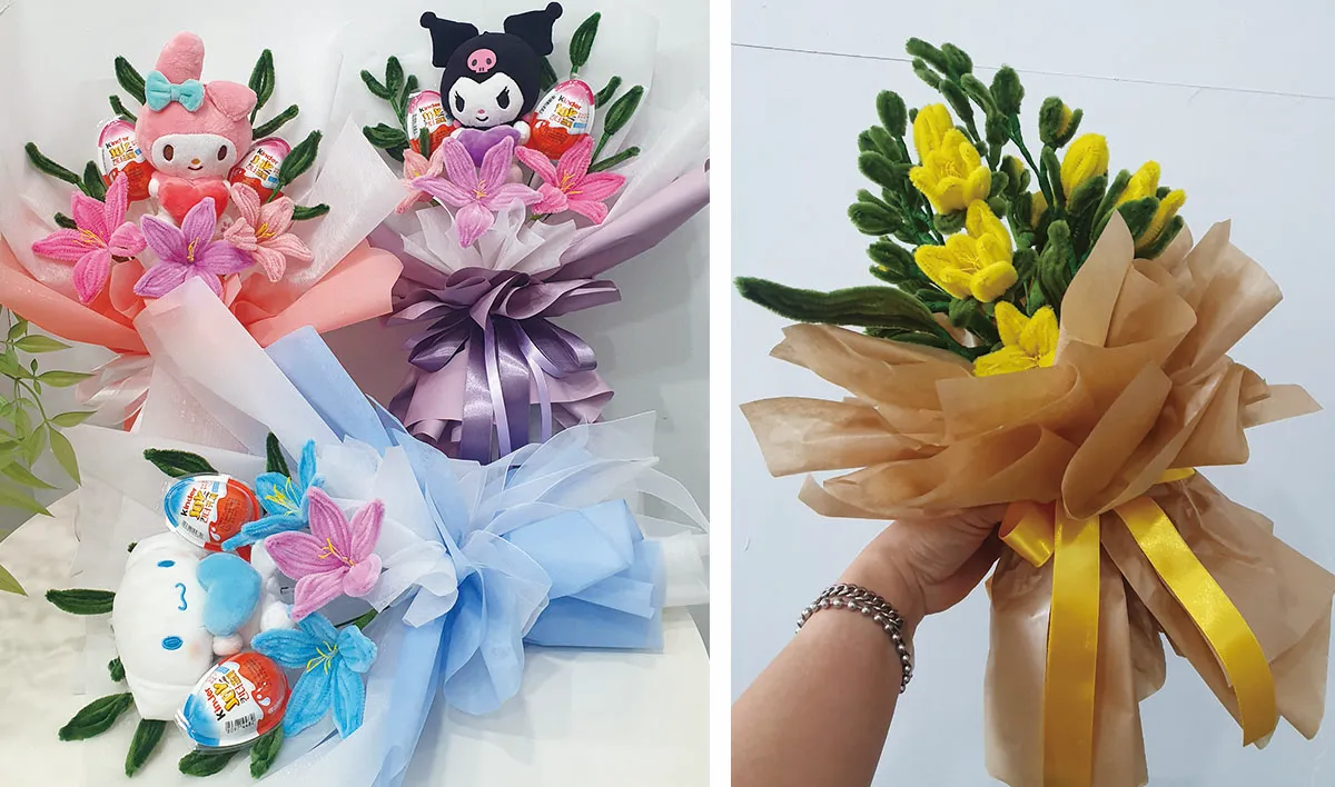 모루로 만든 꽃을 이용한 꽃다발은 귀여운 캐릭터 인형들과도 잘 어울려서 유치원 졸업식이나 행사에 추천드려요.