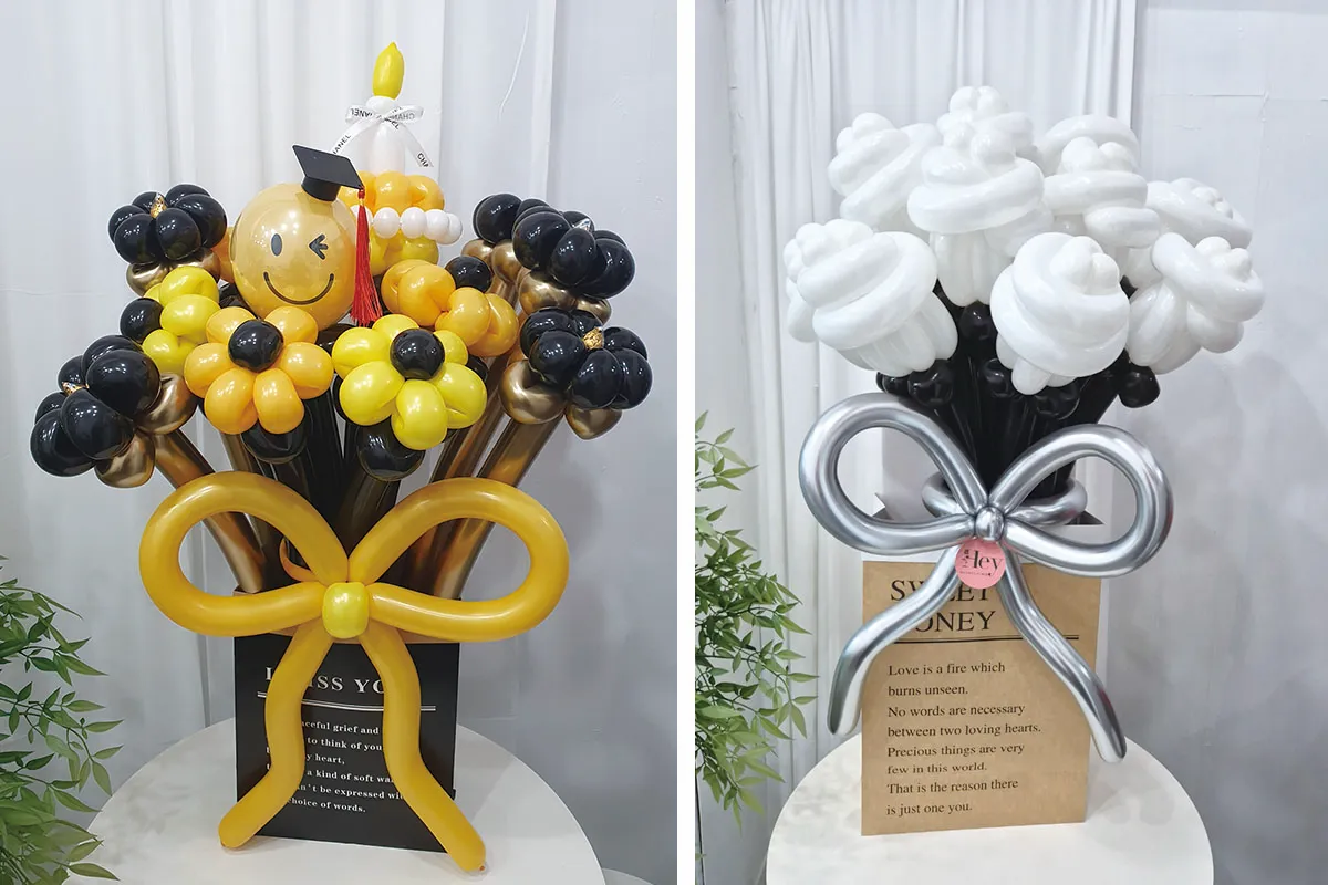 기존 풍선꽃다발은 풍선 안에 인형이랑 꽃이랑 넣어서 포장하는 방식의 꽃다발들이 인기가 많았었는데요. 요즘은 긴 요술풍선으로 꽃을 만들고 다발로 만드는 방식의 풍선꽃다발이 인기가 많아지고 있어요. 다양한 풍선의 컬러가 있어서 핑크계열이나 블루계열도 예쁘고요. 졸업에는 학사모 쓴 스마일 풍선을 넣어도 귀엽고 예쁘더라고요.